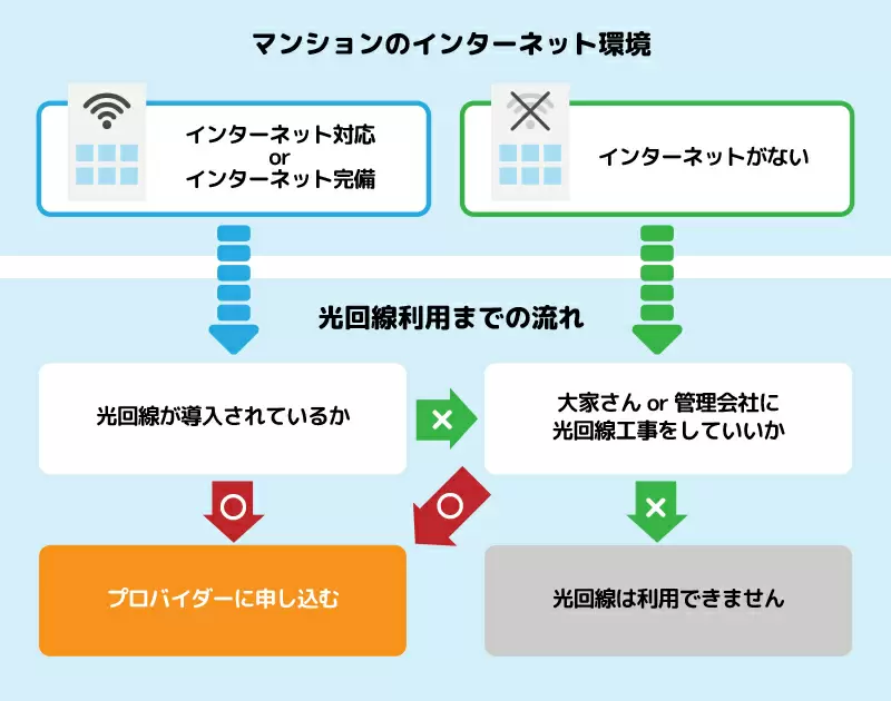 光回線が導入されている場合は、さらに2つのケースに分けられます。回線が「集合住宅の共用部分まで引き込まれている場合」と「各部屋まで引き込まれている場合」です。