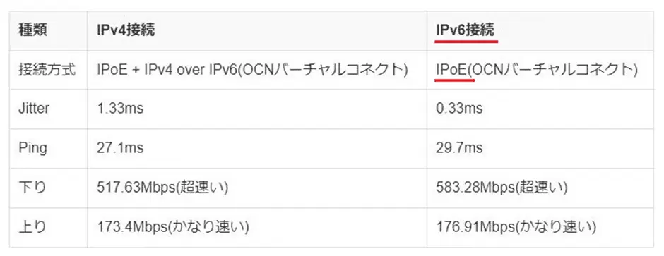 スピードテストが完了し、IPoEの対応が確認できると、上のような結果が表示されます。PPPoE接続の場合、結果は1列のみの表示になります。