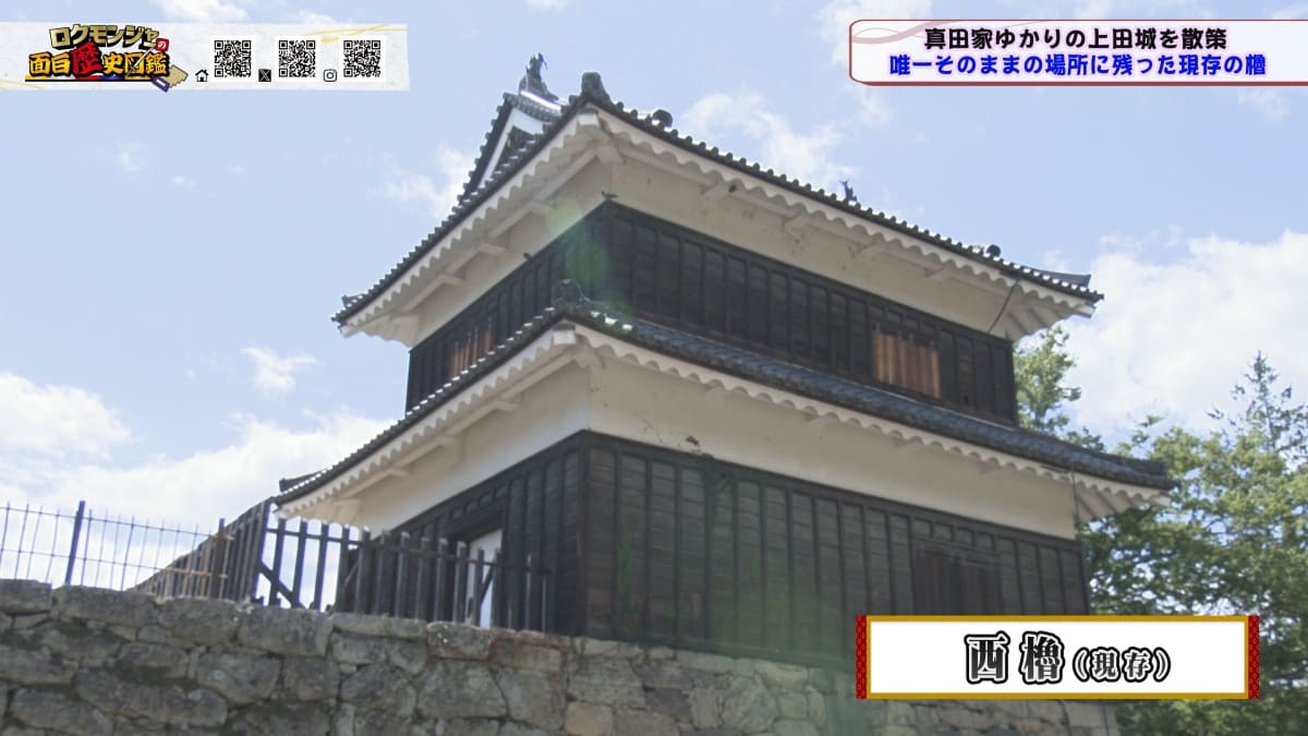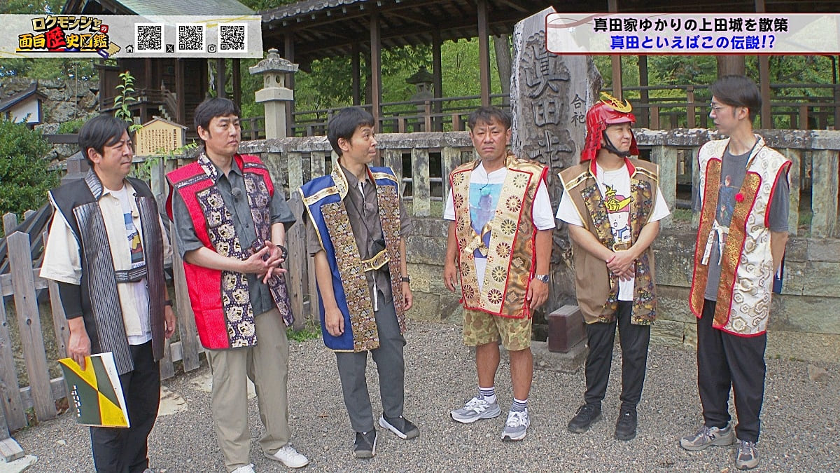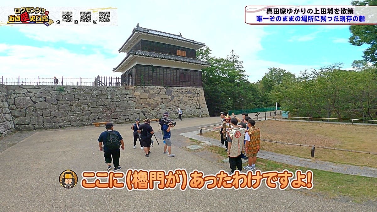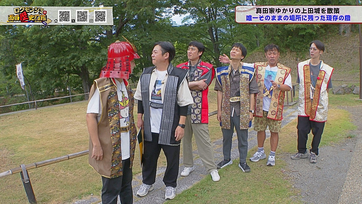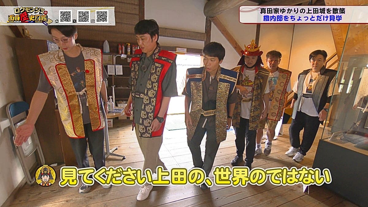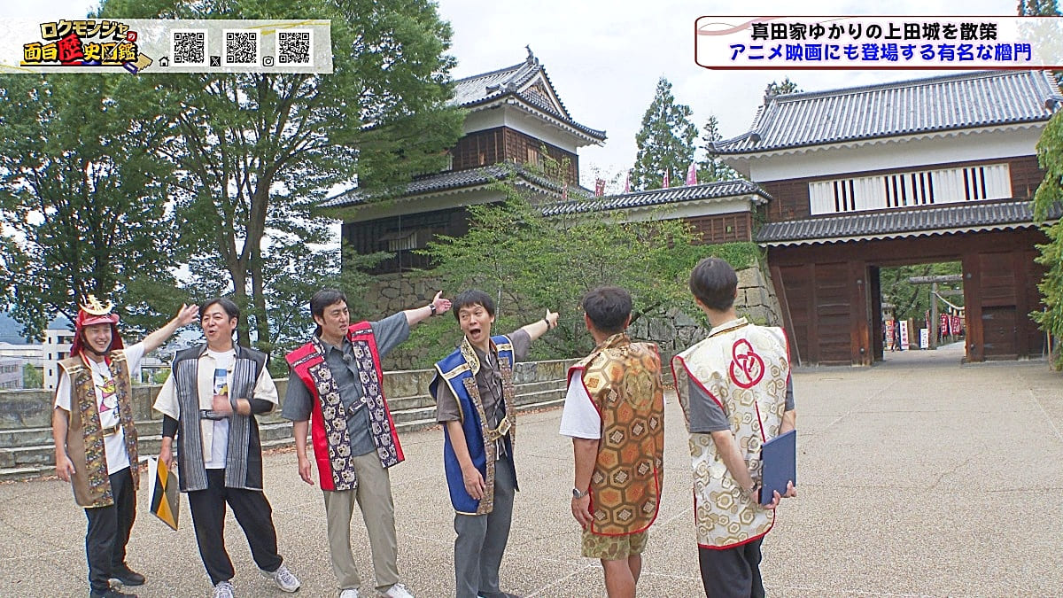 ※他ケーブルテレビでの放送日時は異なる場合がございます、ご契約のケーブルテレビ今日の番組表をご確認ください金田さんのマスターオブセレモニーで動き出した今回のロクモンジャー!前回から真田家ゆかりの地、上田城の散策を開始。今回は散策の続きから再開です!まず一行が訪れたのは上田城のメインといっても過言ではない櫓門。この櫓門、両脇に南櫓と北櫓を従え、堂々たる雰囲気を醸し出しています。 歴史好きにはたまらない場所ですが、そうでない方も大興奮する場所だったんです!ご存じの方も多いと思いますが、大人気映画「サマーウォーズ」に出てくる陣内家の本家が、こちらの櫓門を参考に描かれているんです!サマーウォーズ好きにしてみたら、この場所が聖地巡礼のスポットになるわけです!! そんな櫓門を抜けようと先へ進むと大きな岩に遭遇!この岩は真田石と呼ばれており、とても面白い逸話も残されています。どんな逸話が残されているかは本編でご確認ください。 更にそこから発展し、いけやクイズが発動!真田親子の話し合いの場についての3択クイズ。いったいどんな内容なのか??櫓門を越えた一行は、櫓門内部の散策へと進んでいきます。櫓門内部を見る前にまずは南櫓を散策。そこで気になるものを発見した金田さん!そこにあったのは何と世界のYAZAWA???更に奥へと進んだ櫓門内部にはなんと火縄銃が一丁。この火縄銃を構え櫓門の格子から外を狙う疑似体験ができるんです! こうなってくると、やらないわけにはいかない一行!このキルゾーン実現は当然、博さんの役目!博さんが単身外へ出て敵役を実演!果たして博さんは無事櫓門を向ける事ができるのか??博さんの安否も気になりますが、番組はさらに先へと進んでいきます。櫓門を抜けた先にあるのは眞田神社。実はこの神社、ロクモンジャーととても深い縁があるんです。その縁とは?? なんと9年前にバスツアーで訪れた神社だったんです。その際、6人で撮った写真を思い出し、同じポーズで写真を撮ることに!!9年前と現在のロクモンジャーが一つの画面に収まりました♪更にここ眞田神社で絵馬に願い事を書いていたことを思い出し、その絵馬を探すことに!! 果たして9年前に書いた絵馬は残されているのでしょうか?眞田神社では大欅御神木くぐりを体験したのち、全員で参拝。更に奥へ進むと真田井戸が。こちらではいけやクイズが再び発動。どんな問題が出たのかは本編でご確認、そして挑戦してみてください。 真田井戸を散策した後、一行が向かったのは西櫓。こちらの櫓は当時から場所も変わらず立ち続ける現存の櫓です。当時の建造物がそのまま、その場所に残り続ける!これって実は本当に凄い事なんですよね!目の前で現存の西櫓を見て改めて実感します。 今回も見どころ盛りだくさん!ぜひご覧ください♪
