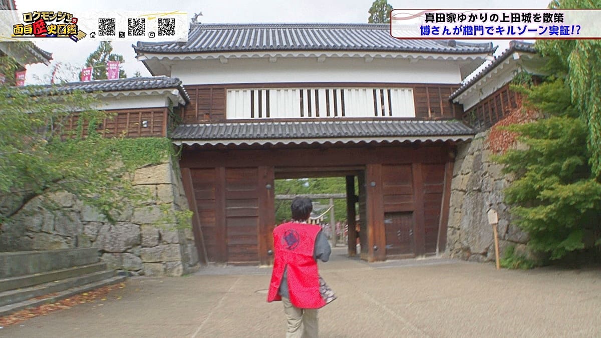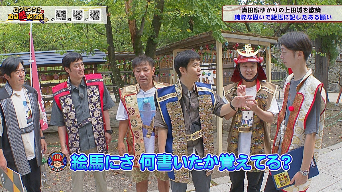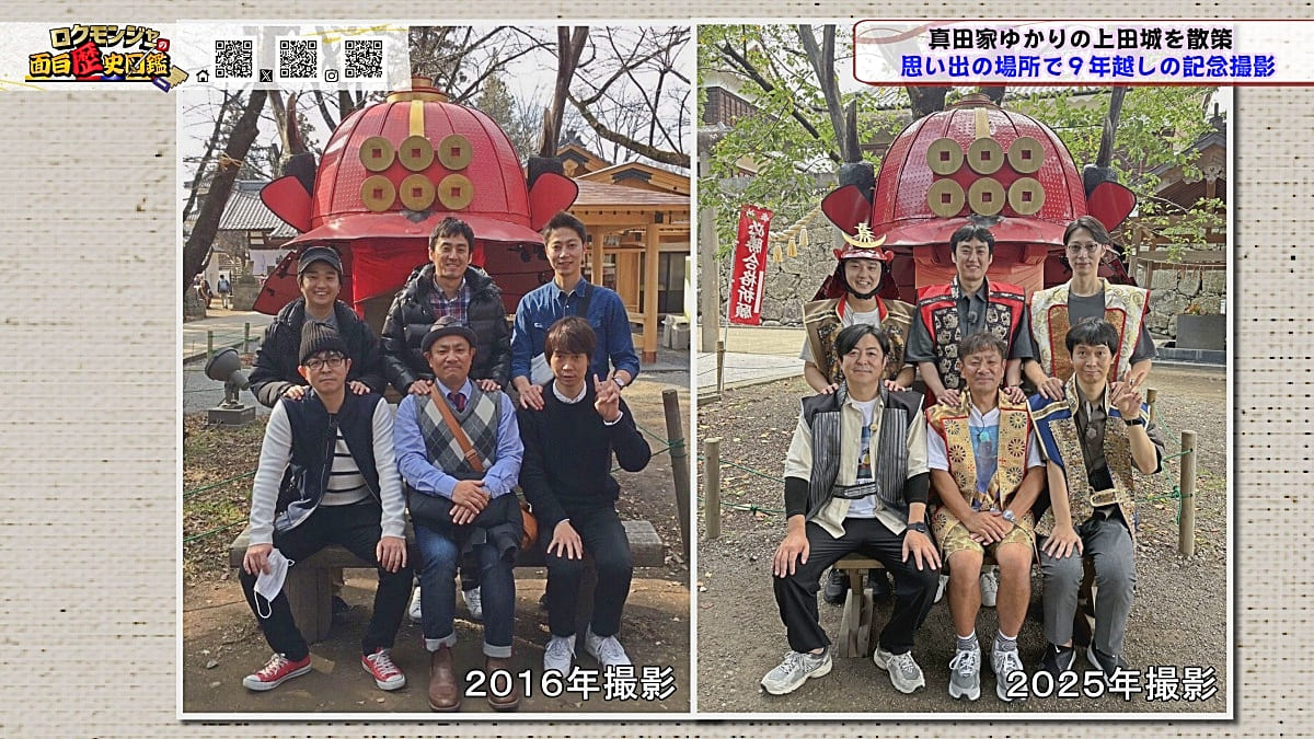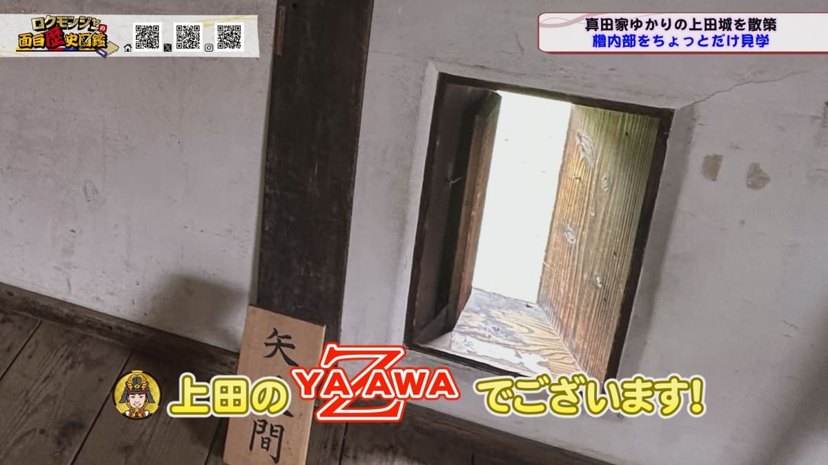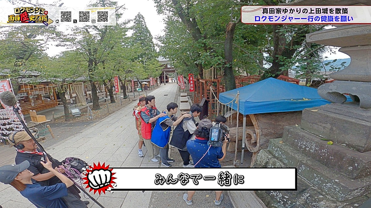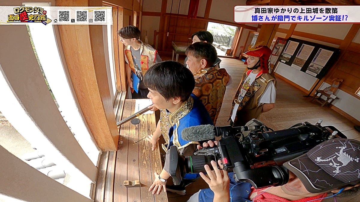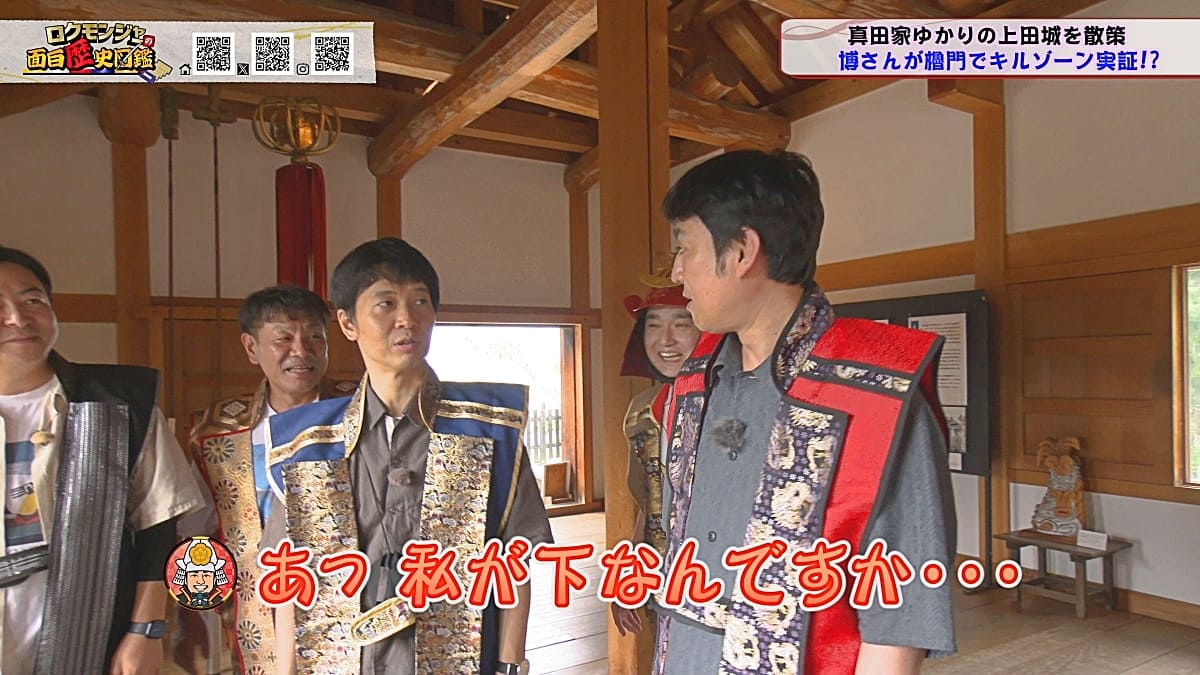 ※他ケーブルテレビでの放送日時は異なる場合がございます、ご契約のケーブルテレビ今日の番組表をご確認ください金田さんのマスターオブセレモニーで動き出した今回のロクモンジャー!前回から真田家ゆかりの地、上田城の散策を開始。今回は散策の続きから再開です!まず一行が訪れたのは上田城のメインといっても過言ではない櫓門。この櫓門、両脇に南櫓と北櫓を従え、堂々たる雰囲気を醸し出しています。 歴史好きにはたまらない場所ですが、そうでない方も大興奮する場所だったんです!ご存じの方も多いと思いますが、大人気映画「サマーウォーズ」に出てくる陣内家の本家が、こちらの櫓門を参考に描かれているんです!サマーウォーズ好きにしてみたら、この場所が聖地巡礼のスポットになるわけです!! そんな櫓門を抜けようと先へ進むと大きな岩に遭遇!この岩は真田石と呼ばれており、とても面白い逸話も残されています。どんな逸話が残されているかは本編でご確認ください。 更にそこから発展し、いけやクイズが発動!真田親子の話し合いの場についての3択クイズ。いったいどんな内容なのか??櫓門を越えた一行は、櫓門内部の散策へと進んでいきます。櫓門内部を見る前にまずは南櫓を散策。そこで気になるものを発見した金田さん!そこにあったのは何と世界のYAZAWA???更に奥へと進んだ櫓門内部にはなんと火縄銃が一丁。この火縄銃を構え櫓門の格子から外を狙う疑似体験ができるんです! こうなってくると、やらないわけにはいかない一行!このキルゾーン実現は当然、博さんの役目!博さんが単身外へ出て敵役を実演!果たして博さんは無事櫓門を向ける事ができるのか??博さんの安否も気になりますが、番組はさらに先へと進んでいきます。櫓門を抜けた先にあるのは眞田神社。実はこの神社、ロクモンジャーととても深い縁があるんです。その縁とは?? なんと9年前にバスツアーで訪れた神社だったんです。その際、6人で撮った写真を思い出し、同じポーズで写真を撮ることに!!9年前と現在のロクモンジャーが一つの画面に収まりました♪更にここ眞田神社で絵馬に願い事を書いていたことを思い出し、その絵馬を探すことに!! 果たして9年前に書いた絵馬は残されているのでしょうか?眞田神社では大欅御神木くぐりを体験したのち、全員で参拝。更に奥へ進むと真田井戸が。こちらではいけやクイズが再び発動。どんな問題が出たのかは本編でご確認、そして挑戦してみてください。 真田井戸を散策した後、一行が向かったのは西櫓。こちらの櫓は当時から場所も変わらず立ち続ける現存の櫓です。当時の建造物がそのまま、その場所に残り続ける!これって実は本当に凄い事なんですよね!目の前で現存の西櫓を見て改めて実感します。 今回も見どころ盛りだくさん!ぜひご覧ください♪