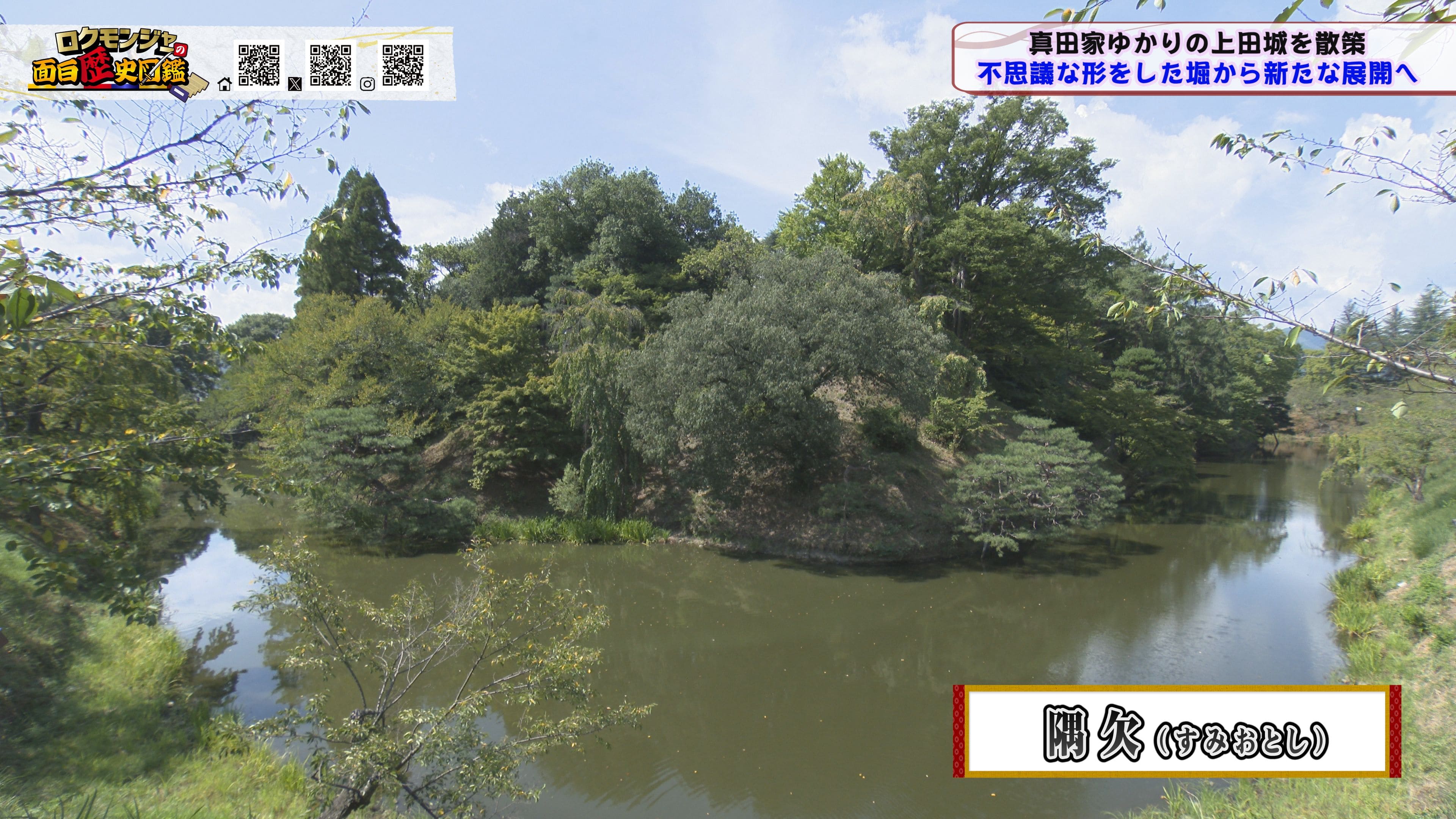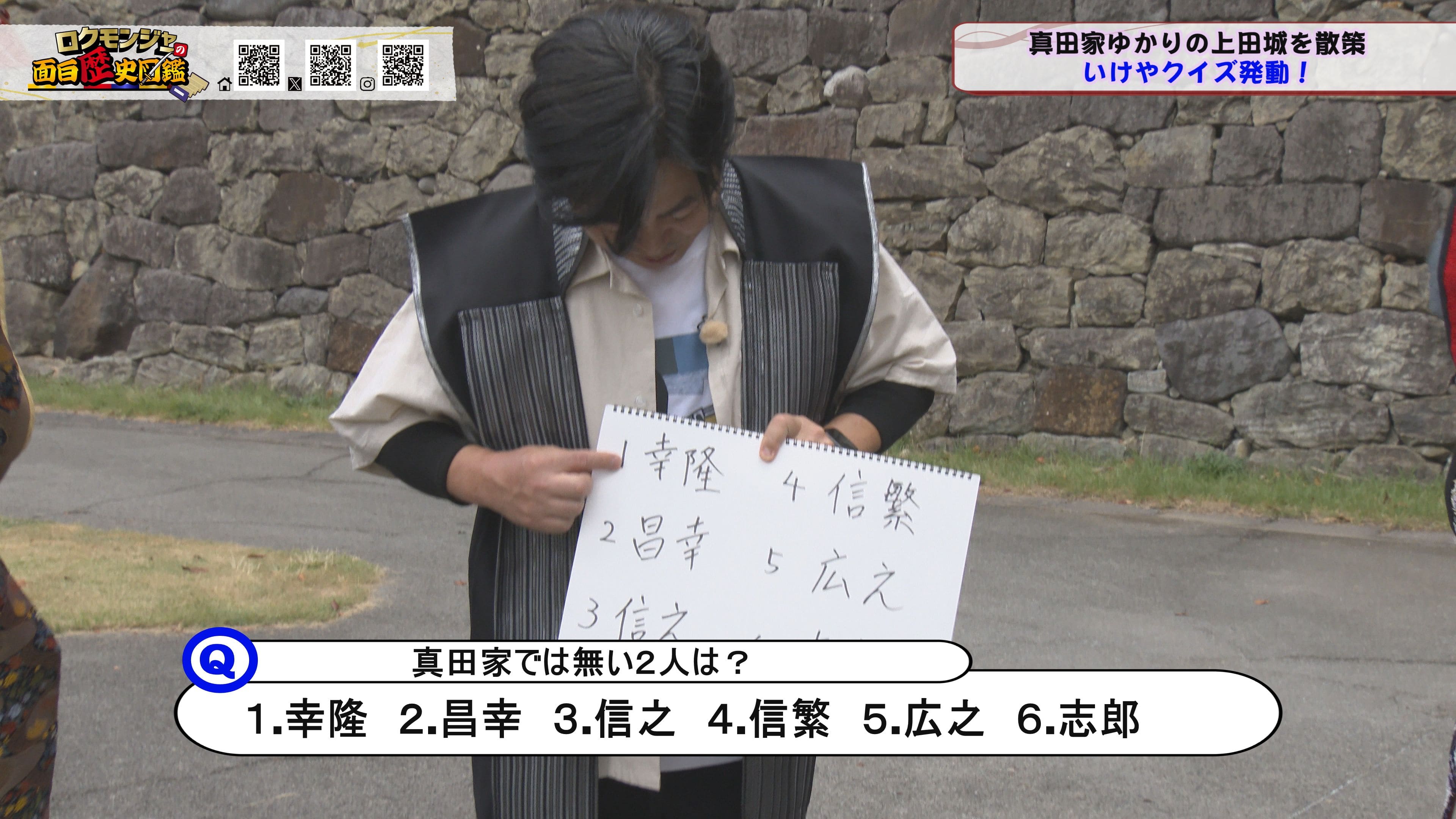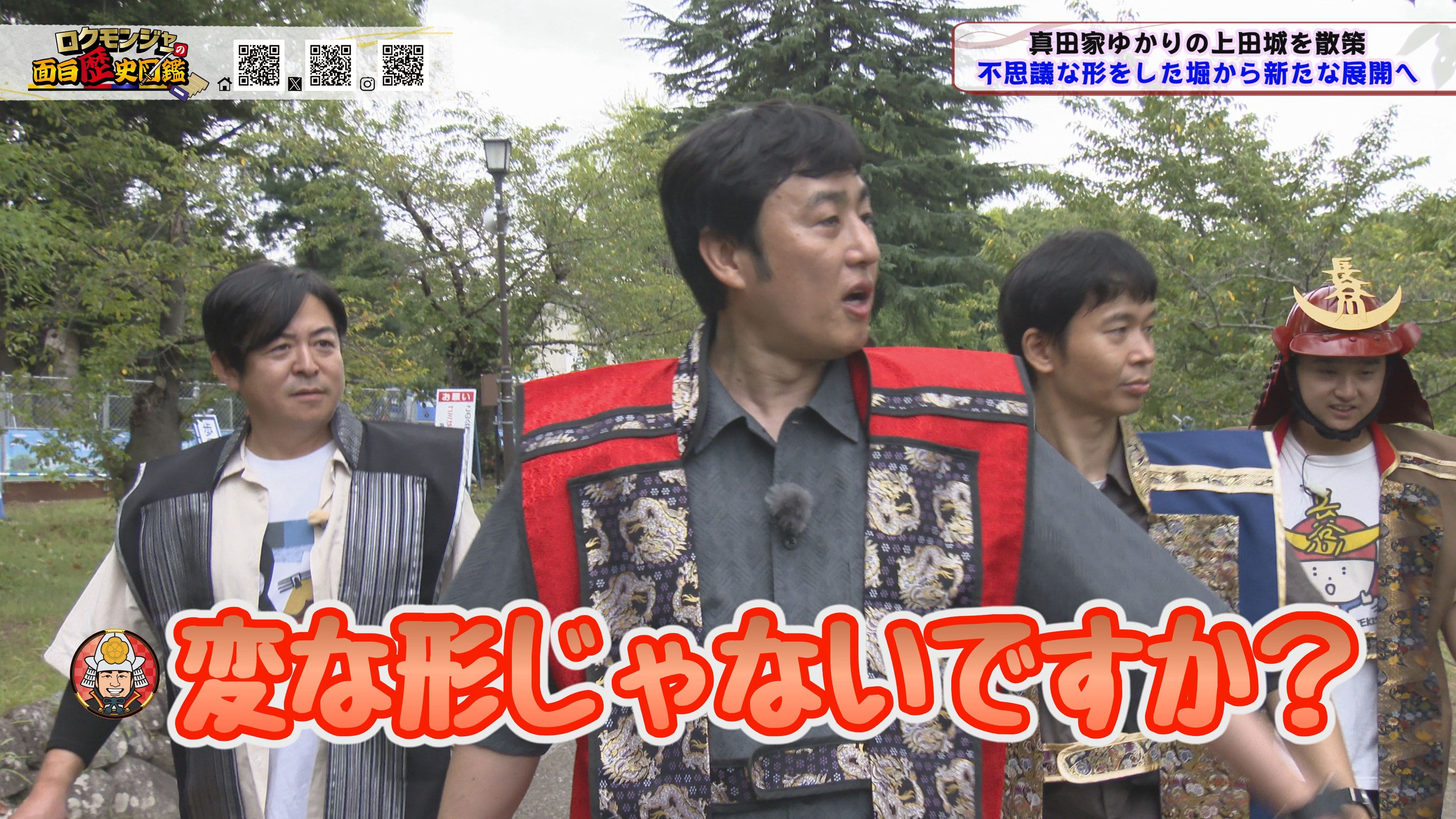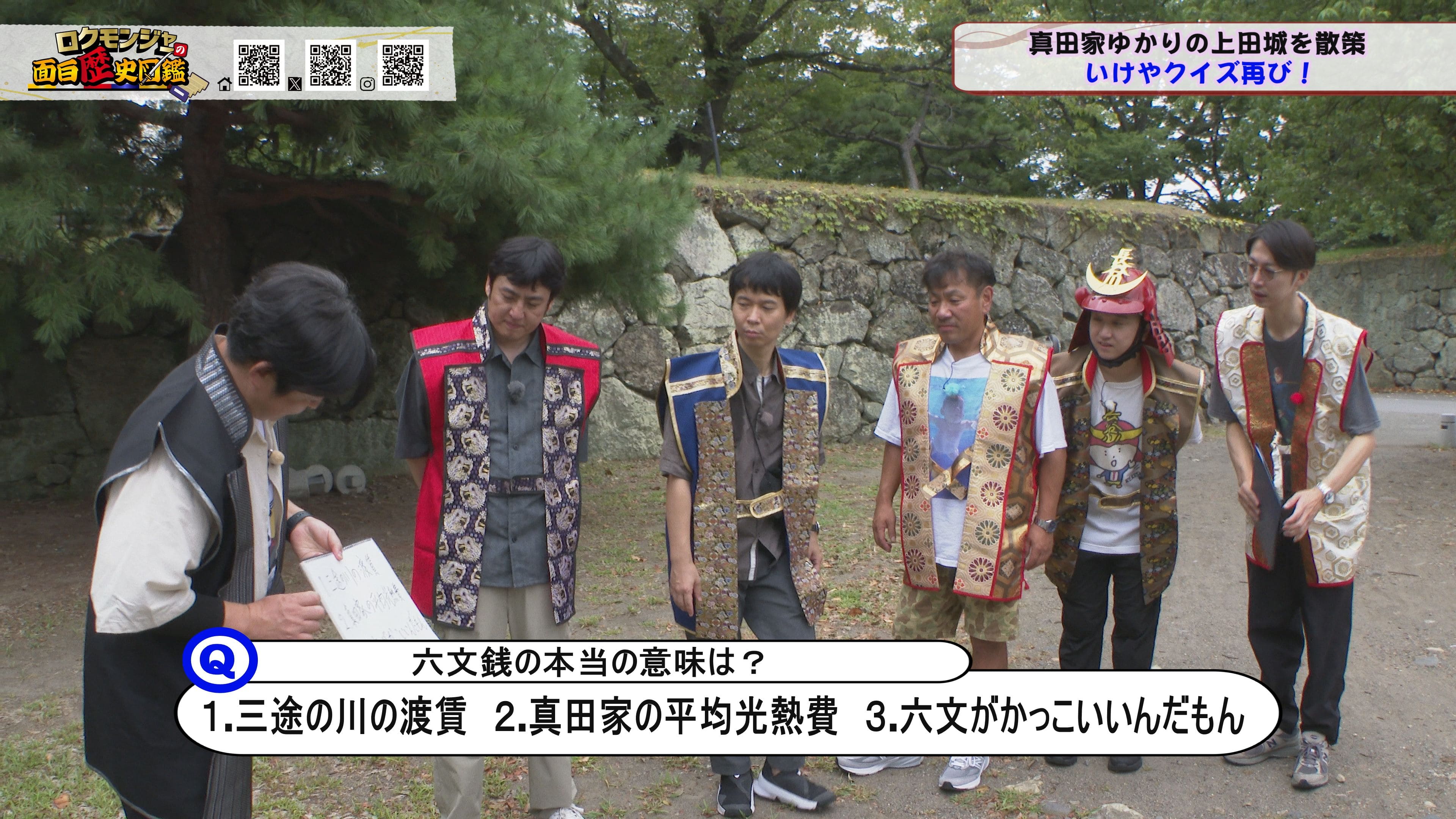 ※他ケーブルテレビでの放送日時は異なる場合がございます、ご契約のケーブルテレビ今日の番組表をご確認ください金田さんのマスターオブセレモニーで動き出した今回のロクモンジャー!前回から真田家ゆかりの地、上田城の散策を開始。今回は散策の続きから再開です!まず一行が訪れたのは上田城のメインといっても過言ではない櫓門。この櫓門、両脇に南櫓と北櫓を従え、堂々たる雰囲気を醸し出しています。 歴史好きにはたまらない場所ですが、そうでない方も大興奮する場所だったんです!ご存じの方も多いと思いますが、大人気映画「サマーウォーズ」に出てくる陣内家の本家が、こちらの櫓門を参考に描かれているんです!サマーウォーズ好きにしてみたら、この場所が聖地巡礼のスポットになるわけです!! そんな櫓門を抜けようと先へ進むと大きな岩に遭遇!この岩は真田石と呼ばれており、とても面白い逸話も残されています。どんな逸話が残されているかは本編でご確認ください。 更にそこから発展し、いけやクイズが発動!真田親子の話し合いの場についての3択クイズ。いったいどんな内容なのか??櫓門を越えた一行は、櫓門内部の散策へと進んでいきます。櫓門内部を見る前にまずは南櫓を散策。そこで気になるものを発見した金田さん!そこにあったのは何と世界のYAZAWA???更に奥へと進んだ櫓門内部にはなんと火縄銃が一丁。この火縄銃を構え櫓門の格子から外を狙う疑似体験ができるんです! こうなってくると、やらないわけにはいかない一行!このキルゾーン実現は当然、博さんの役目!博さんが単身外へ出て敵役を実演!果たして博さんは無事櫓門を向ける事ができるのか??博さんの安否も気になりますが、番組はさらに先へと進んでいきます。櫓門を抜けた先にあるのは眞田神社。実はこの神社、ロクモンジャーととても深い縁があるんです。その縁とは?? なんと9年前にバスツアーで訪れた神社だったんです。その際、6人で撮った写真を思い出し、同じポーズで写真を撮ることに!!9年前と現在のロクモンジャーが一つの画面に収まりました♪更にここ眞田神社で絵馬に願い事を書いていたことを思い出し、その絵馬を探すことに!! 果たして9年前に書いた絵馬は残されているのでしょうか?眞田神社では大欅御神木くぐりを体験したのち、全員で参拝。更に奥へ進むと真田井戸が。こちらではいけやクイズが再び発動。どんな問題が出たのかは本編でご確認、そして挑戦してみてください。 真田井戸を散策した後、一行が向かったのは西櫓。こちらの櫓は当時から場所も変わらず立ち続ける現存の櫓です。当時の建造物がそのまま、その場所に残り続ける!これって実は本当に凄い事なんですよね!目の前で現存の西櫓を見て改めて実感します。 今回も見どころ盛りだくさん!ぜひご覧ください♪