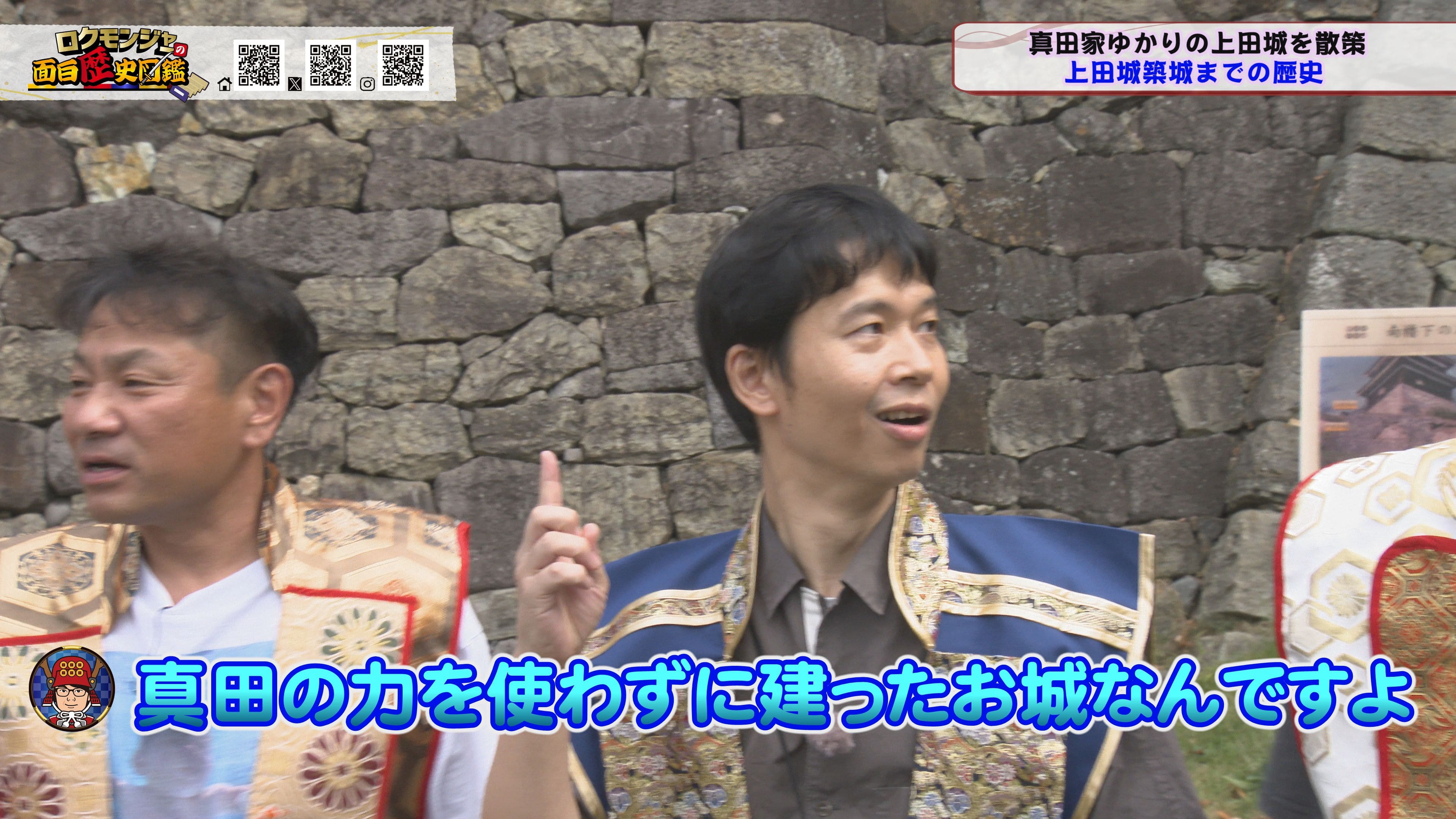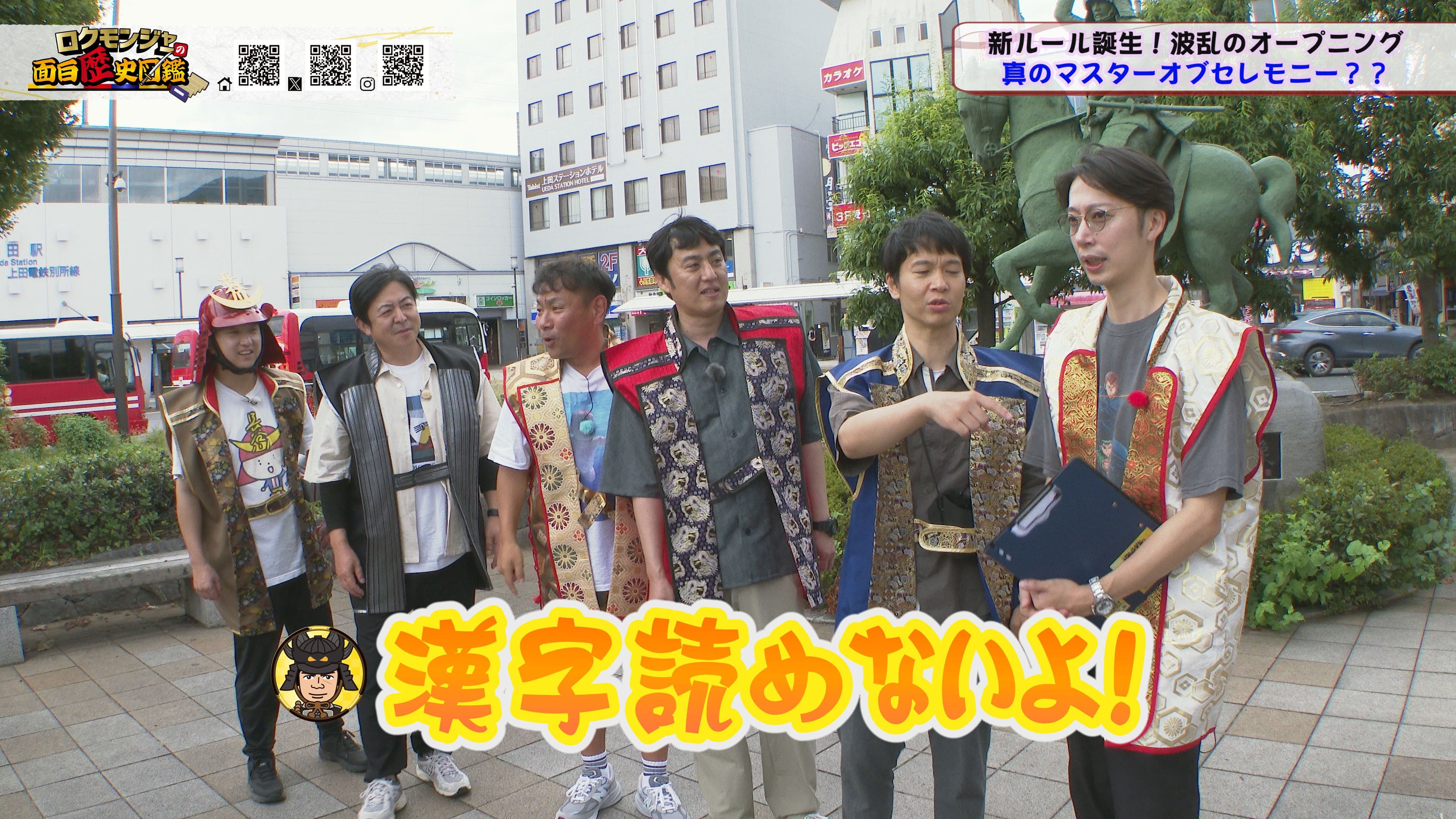 ※他ケーブルテレビでの放送日時は異なる場合がございます、ご契約のケーブルテレビ今日の番組表をご確認ください10月のロクモンジャーは長野県上田市からお届け。上田市を代表する武将といえば真田!真田家の歴史を、ゆかりの地である上田城からお届けいたします。と、その前にまずは上田駅でオープニングを撮影♪ 今回なんと金田さんが進行役を行います!普段、自由奔放な金田さんが進行役にまわった結果・・・台本に無い新たなルールが飛び出し、メンバーやスタッフを困惑させます!!そんな中、ロクモンジャーメンバーも黙ってはいません!金田さんに対しある行動を起こします。其の行動とはいったい?? オープニングから展開盛沢山となった今回、一行が目指した上田城。こちらの上田城では見ごたえ十分な迫力ある景色が一行を出迎えます。そんな景色に後押しされるかのように歴史紹介やうんちく披露、更には恒例となった、いけやクイズが飛び出します!! オープニングもそうでしたが、今回は1所での厚みが違います!!もっと小出しにすればいいのに・・・いえ、違います。話すことが多すぎて詰め込むしかないんです!! 上田城、真田家にまつわる話、これ本当に面白いんです!是非皆さんに見てほしい、聞いてほしい内容盛りだくさんとなっております。 また番組内のミニコーナーではトールさんとれきしクンが上田城の城下町を散策。非常に珍しく、現場でしか手に入らない貴重なお酒に巡り合います。このお酒を試飲した2人の食レポ・・・飲レポ? も、どうぞお楽しみに♪ 更に今回散策している上田城ですが真田家の歴史だけではなく、とても面白い特徴をもったお城だったことが判明します!!一行が散策していたお堀ルートの一ケ所にある驚愕の事実が!!昭和の時代、上田城のお堀の中にあるものがありました。それは一体何なのか??? 金田さんの進行に注目しながら、ぜひお楽しみください♪♪今月のロクモンジャー、面白さに拍車がかかっています!!