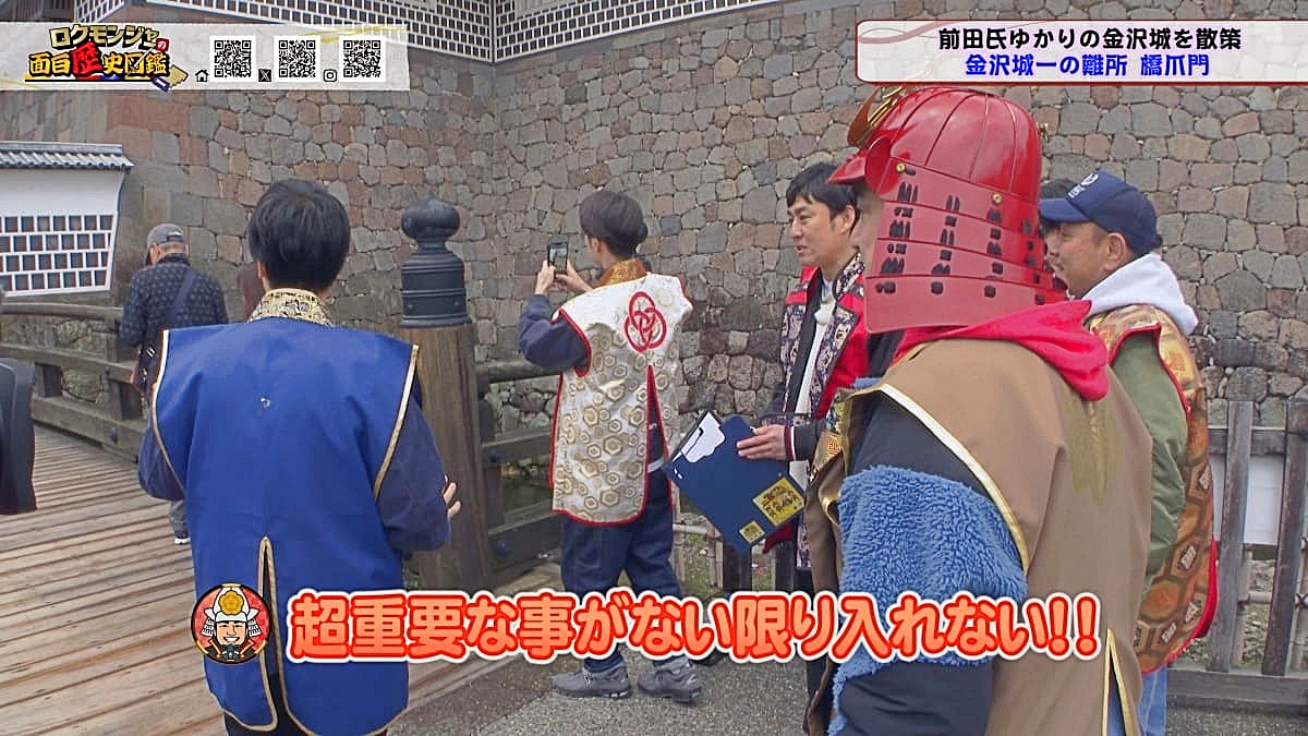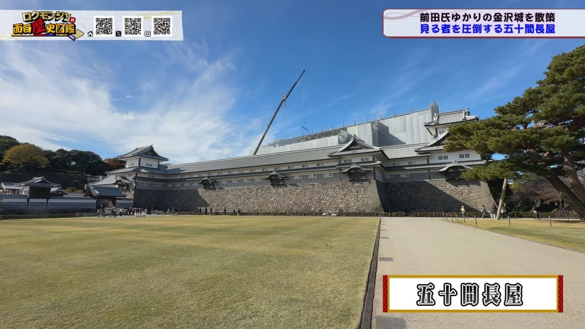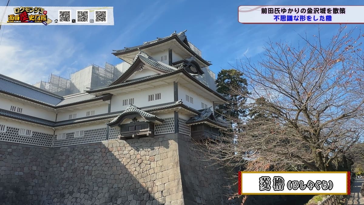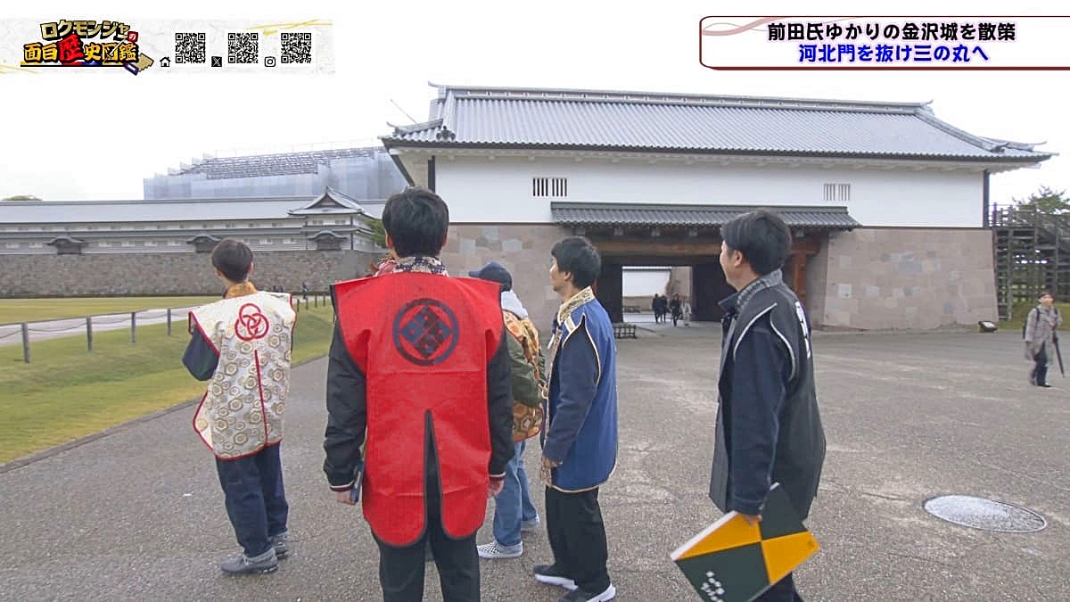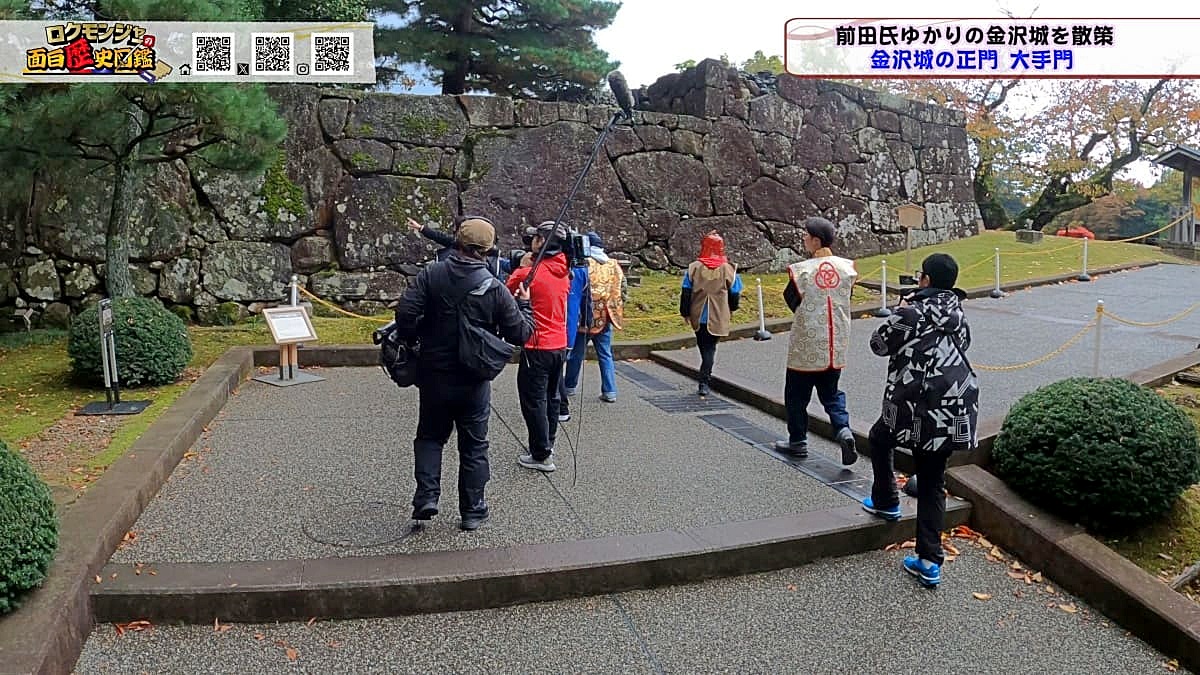 ※他ケーブルテレビでの放送日時は異なる場合がございます、ご契約のケーブルテレビ今日の番組表をご確認ください今回ロクモンジャー一行が訪れたのは石川県金沢市!!金沢に来てオープニングを撮るのはやっぱりここしかありません。そう鼓櫓です。金沢駅東口に構える鼓櫓は訪れた日地が必ず目にしておきたいスポットの一つ!この巨大な鼓門の前でオープニング撮影を開始!! そして今回、司会進行を務めるのは何と博さん♪本人は自由気ままが良いと言ってはいるものの、ローテーションシステムが発動してしまった為逃げられない状況に!一体どんな事になるのかと思いきや、いきなりMCの特権?が発動!!いままで定番にしていた、あるシステムが撤廃となりました。何が撤廃されたのかは番組をチェックしてみてください♪ 鼓門でのオープニング撮影を終えた一行が訪れたのは前田家が城主を務めた金沢城。しかも、これぞロクモンジャーといった場所からのスタートとなります。一般的に金沢城観光に訪れると一番最初にくぐるのは石川門なのですがロクモンジャーは金沢城の正門、大手門から入城!!この場所、石川門とは逆方向にあるため、極端にお客さんが少ないまさに穴場的スポットなんです!! そんな大手門から散策開始、と思いきやいきなりトールさんがやらかします。この日のために仕込んでいたいけやクイズのワードを早くも口にしてしまい、クイズが一問台無しに・・・不可抗力とはいえ、スタートから波乱の展開となりました。 大手門散策では鏡石クラスの石がゴロゴロしている凄さに驚愕しながら加賀がいかに凄いかを紹介。房野さんが参勤交代の片道にかかる金額を算出してきてくれたのですがその金額がとんでもなく一行は驚愕!! 大手門を抜け、先へと進むとそこには広大な広場が!この場所は新丸といい、二の丸や三の丸の後につくられた場所なんだそうです。この場所では金田さんが暴走!撮影隊を無視し、一人どこかに向かっていきます。その向かった先で見た光景は!!この光景を目にしてしまっては吸い込まれるのも致し方なし・・・ 新丸を抜け一行がたどり着いたのは河北門。この門はとても特徴的で博さんのテンションも一気に上がっていきます。櫓を持たない睨み櫓に、海鼠壁!あまり聞き覚えのない単語が続きますが、この説明は博さんがしっかりしてくれますのでご安心ください。 河北門をぬけると、ようやく三の丸。そしてここから見える景色が金沢城のシンボルともいえる五十間長屋!写真などで一度は目にしたことがある方も多いと思いますがこれ、目の前で見ると本当に感動します。五十間長屋、その名の通り長~い建物なのですが、博さんはその足元である石垣に注目します!この石垣、実はとても面白い特徴を持っているんですよ♪ そんな五十間長屋の先にある菱櫓!この櫓も特徴のある面白い櫓だったんです!!その特徴にリンクして、いけやさんのフェチが爆発!!十数年共にした仲間が「知らなかった」という、いけやさんのフェチとは? 菱櫓(外)の散策を終えた一行は先へと進みます。一行が向かったのは橋爪門!金沢城一、強固な守りの橋爪門から中に入るとそこは大きな桝形!ここでも驚愕の光景を目にすることになります!更に博さん得意のダダダダでは、スタッフが巻き込まれ大惨事に!! 12月のロクモンジャーも見どころ満載です。どうぞお楽しみに♪