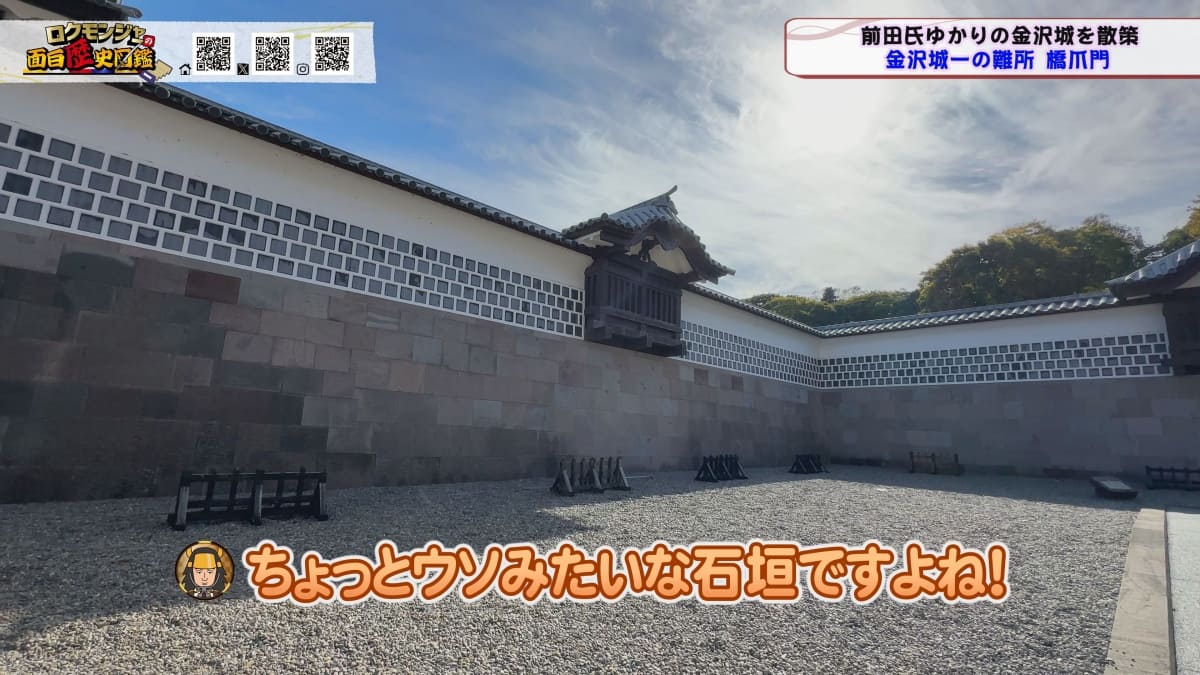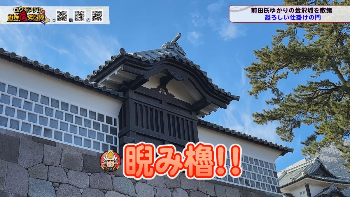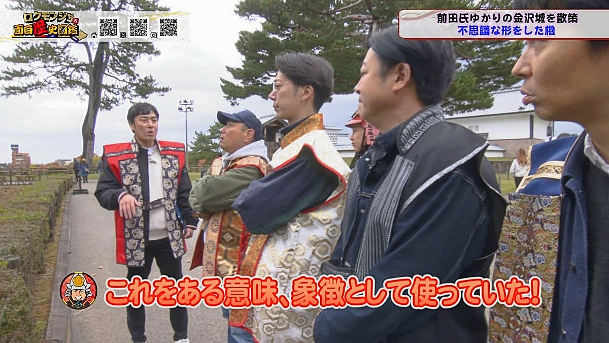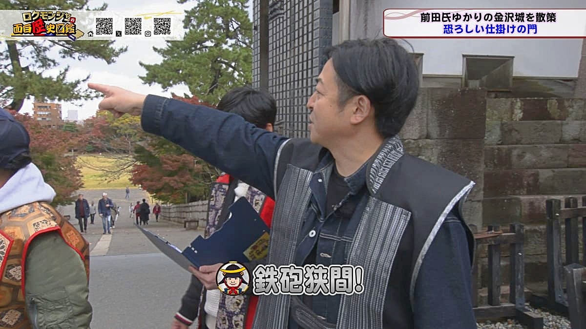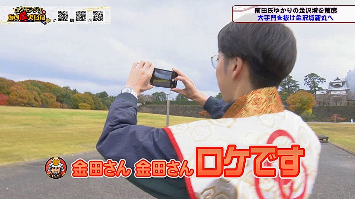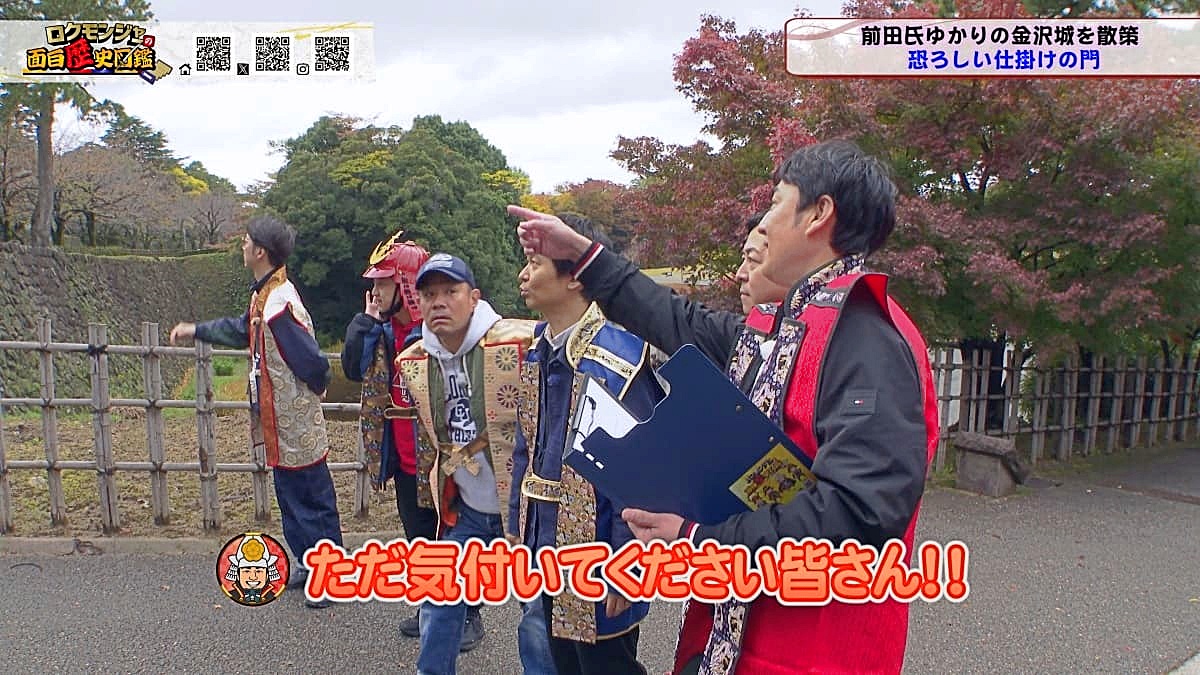 ※他ケーブルテレビでの放送日時は異なる場合がございます、ご契約のケーブルテレビ今日の番組表をご確認ください今回ロクモンジャー一行が訪れたのは石川県金沢市!!金沢に来てオープニングを撮るのはやっぱりここしかありません。そう鼓櫓です。金沢駅東口に構える鼓櫓は訪れた日地が必ず目にしておきたいスポットの一つ!この巨大な鼓門の前でオープニング撮影を開始!! そして今回、司会進行を務めるのは何と博さん♪本人は自由気ままが良いと言ってはいるものの、ローテーションシステムが発動してしまった為逃げられない状況に!一体どんな事になるのかと思いきや、いきなりMCの特権?が発動!!いままで定番にしていた、あるシステムが撤廃となりました。何が撤廃されたのかは番組をチェックしてみてください♪ 鼓門でのオープニング撮影を終えた一行が訪れたのは前田家が城主を務めた金沢城。しかも、これぞロクモンジャーといった場所からのスタートとなります。一般的に金沢城観光に訪れると一番最初にくぐるのは石川門なのですがロクモンジャーは金沢城の正門、大手門から入城!!この場所、石川門とは逆方向にあるため、極端にお客さんが少ないまさに穴場的スポットなんです!! そんな大手門から散策開始、と思いきやいきなりトールさんがやらかします。この日のために仕込んでいたいけやクイズのワードを早くも口にしてしまい、クイズが一問台無しに・・・不可抗力とはいえ、スタートから波乱の展開となりました。 大手門散策では鏡石クラスの石がゴロゴロしている凄さに驚愕しながら加賀がいかに凄いかを紹介。房野さんが参勤交代の片道にかかる金額を算出してきてくれたのですがその金額がとんでもなく一行は驚愕!! 大手門を抜け、先へと進むとそこには広大な広場が!この場所は新丸といい、二の丸や三の丸の後につくられた場所なんだそうです。この場所では金田さんが暴走!撮影隊を無視し、一人どこかに向かっていきます。その向かった先で見た光景は!!この光景を目にしてしまっては吸い込まれるのも致し方なし・・・ 新丸を抜け一行がたどり着いたのは河北門。この門はとても特徴的で博さんのテンションも一気に上がっていきます。櫓を持たない睨み櫓に、海鼠壁!あまり聞き覚えのない単語が続きますが、この説明は博さんがしっかりしてくれますのでご安心ください。 河北門をぬけると、ようやく三の丸。そしてここから見える景色が金沢城のシンボルともいえる五十間長屋!写真などで一度は目にしたことがある方も多いと思いますがこれ、目の前で見ると本当に感動します。五十間長屋、その名の通り長~い建物なのですが、博さんはその足元である石垣に注目します!この石垣、実はとても面白い特徴を持っているんですよ♪ そんな五十間長屋の先にある菱櫓!この櫓も特徴のある面白い櫓だったんです!!その特徴にリンクして、いけやさんのフェチが爆発!!十数年共にした仲間が「知らなかった」という、いけやさんのフェチとは? 菱櫓(外)の散策を終えた一行は先へと進みます。一行が向かったのは橋爪門!金沢城一、強固な守りの橋爪門から中に入るとそこは大きな桝形!ここでも驚愕の光景を目にすることになります!更に博さん得意のダダダダでは、スタッフが巻き込まれ大惨事に!! 12月のロクモンジャーも見どころ満載です。どうぞお楽しみに♪