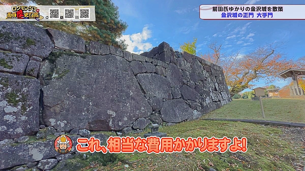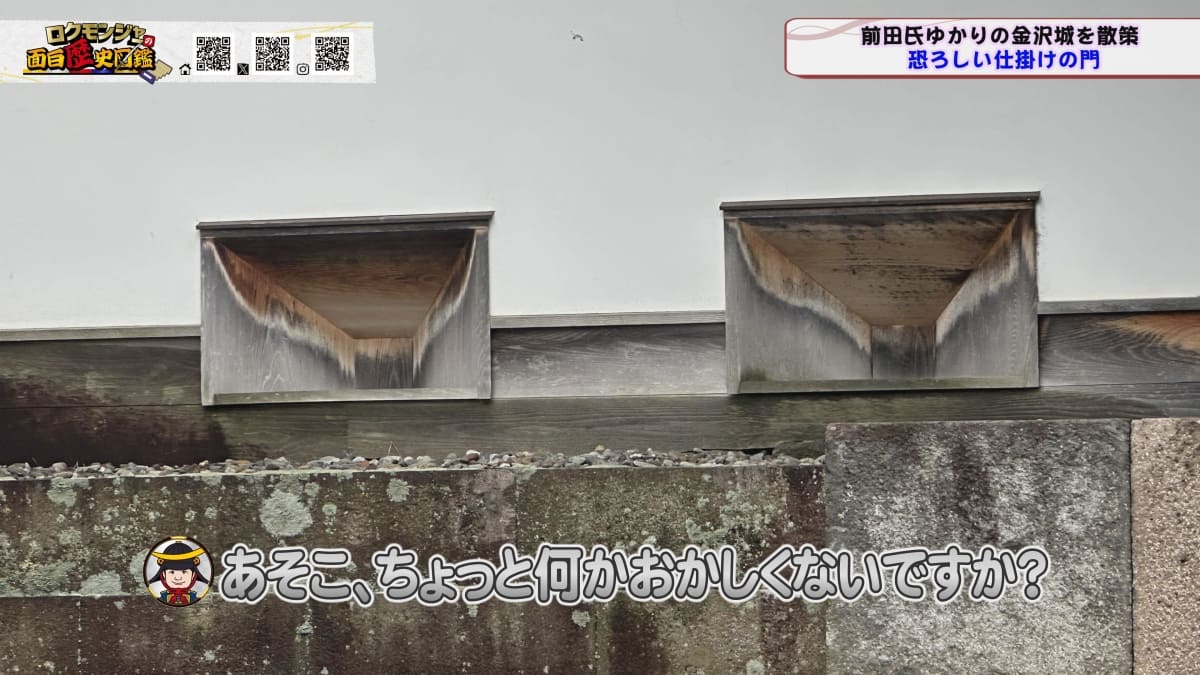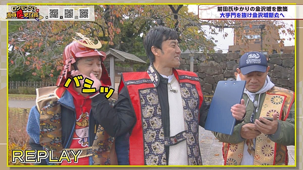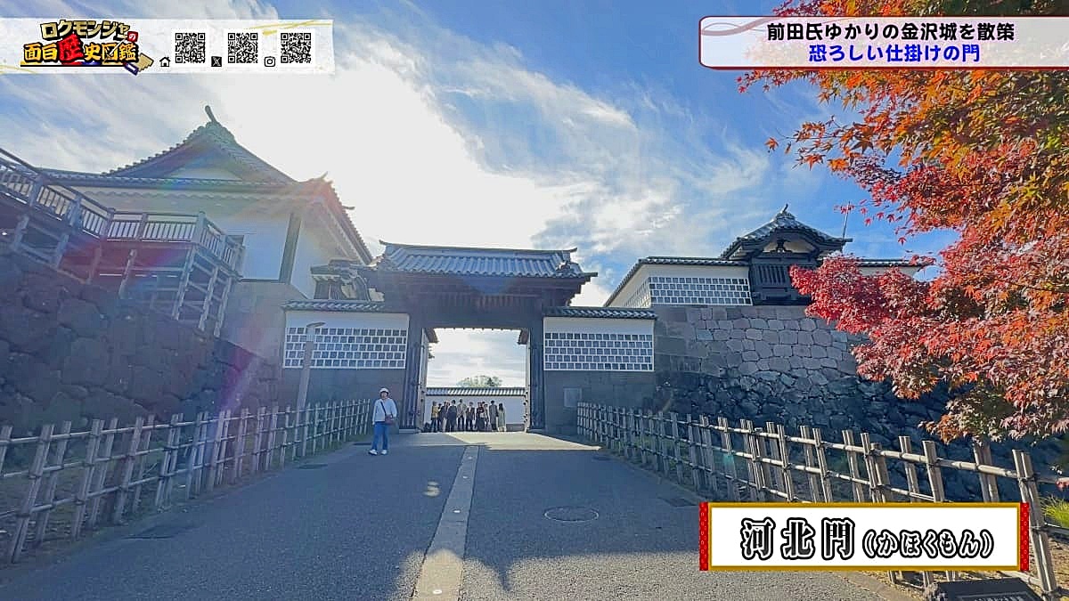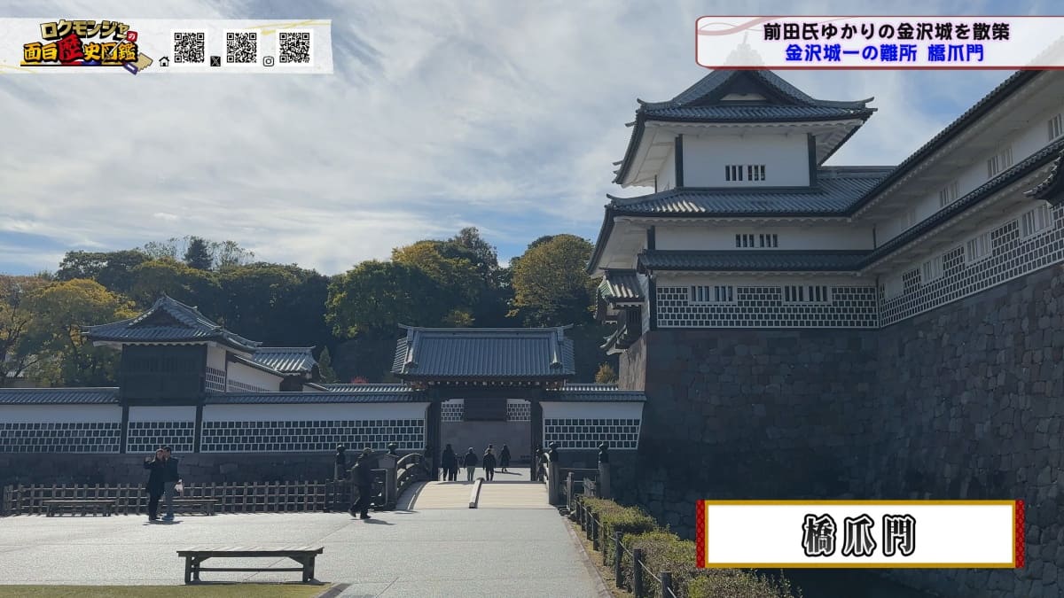 ※他ケーブルテレビでの放送日時は異なる場合がございます、ご契約のケーブルテレビ今日の番組表をご確認ください今回ロクモンジャー一行が訪れたのは石川県金沢市!!金沢に来てオープニングを撮るのはやっぱりここしかありません。そう鼓櫓です。金沢駅東口に構える鼓櫓は訪れた日地が必ず目にしておきたいスポットの一つ!この巨大な鼓門の前でオープニング撮影を開始!! そして今回、司会進行を務めるのは何と博さん♪本人は自由気ままが良いと言ってはいるものの、ローテーションシステムが発動してしまった為逃げられない状況に!一体どんな事になるのかと思いきや、いきなりMCの特権?が発動!!いままで定番にしていた、あるシステムが撤廃となりました。何が撤廃されたのかは番組をチェックしてみてください♪ 鼓門でのオープニング撮影を終えた一行が訪れたのは前田家が城主を務めた金沢城。しかも、これぞロクモンジャーといった場所からのスタートとなります。一般的に金沢城観光に訪れると一番最初にくぐるのは石川門なのですがロクモンジャーは金沢城の正門、大手門から入城!!この場所、石川門とは逆方向にあるため、極端にお客さんが少ないまさに穴場的スポットなんです!! そんな大手門から散策開始、と思いきやいきなりトールさんがやらかします。この日のために仕込んでいたいけやクイズのワードを早くも口にしてしまい、クイズが一問台無しに・・・不可抗力とはいえ、スタートから波乱の展開となりました。 大手門散策では鏡石クラスの石がゴロゴロしている凄さに驚愕しながら加賀がいかに凄いかを紹介。房野さんが参勤交代の片道にかかる金額を算出してきてくれたのですがその金額がとんでもなく一行は驚愕!! 大手門を抜け、先へと進むとそこには広大な広場が!この場所は新丸といい、二の丸や三の丸の後につくられた場所なんだそうです。この場所では金田さんが暴走!撮影隊を無視し、一人どこかに向かっていきます。その向かった先で見た光景は!!この光景を目にしてしまっては吸い込まれるのも致し方なし・・・ 新丸を抜け一行がたどり着いたのは河北門。この門はとても特徴的で博さんのテンションも一気に上がっていきます。櫓を持たない睨み櫓に、海鼠壁!あまり聞き覚えのない単語が続きますが、この説明は博さんがしっかりしてくれますのでご安心ください。 河北門をぬけると、ようやく三の丸。そしてここから見える景色が金沢城のシンボルともいえる五十間長屋!写真などで一度は目にしたことがある方も多いと思いますがこれ、目の前で見ると本当に感動します。五十間長屋、その名の通り長~い建物なのですが、博さんはその足元である石垣に注目します!この石垣、実はとても面白い特徴を持っているんですよ♪ そんな五十間長屋の先にある菱櫓!この櫓も特徴のある面白い櫓だったんです!!その特徴にリンクして、いけやさんのフェチが爆発!!十数年共にした仲間が「知らなかった」という、いけやさんのフェチとは? 菱櫓(外)の散策を終えた一行は先へと進みます。一行が向かったのは橋爪門!金沢城一、強固な守りの橋爪門から中に入るとそこは大きな桝形!ここでも驚愕の光景を目にすることになります!更に博さん得意のダダダダでは、スタッフが巻き込まれ大惨事に!! 12月のロクモンジャーも見どころ満載です。どうぞお楽しみに♪