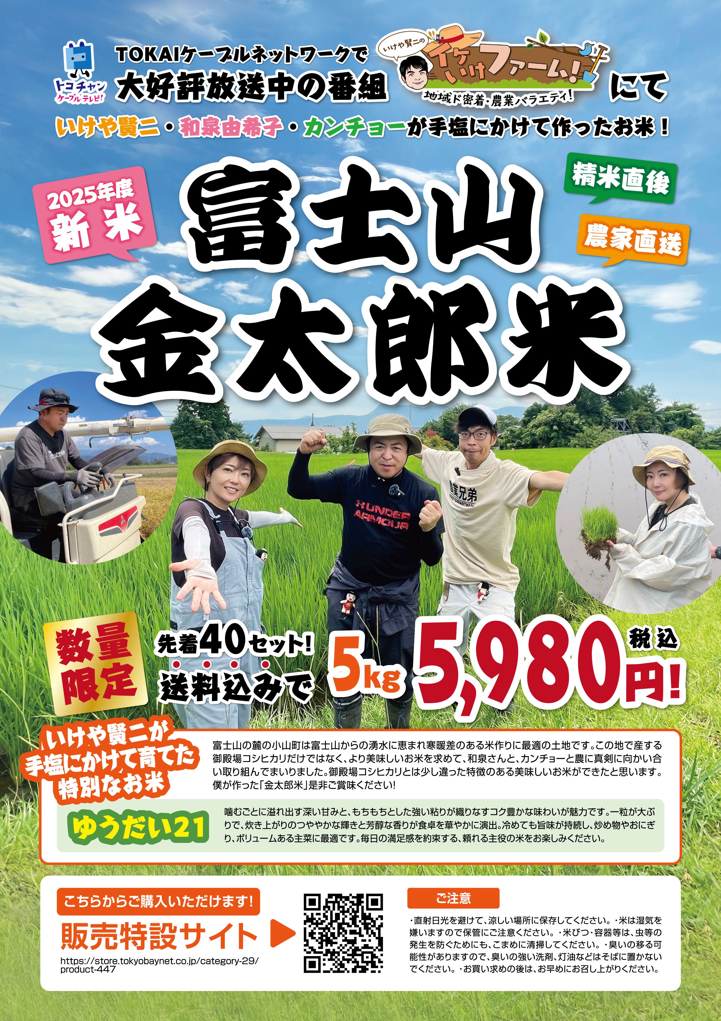 当社コミュニティーチャンネルにて放送中の「いけや賢二のイケイケファーム」番組内で、出演者のいけや賢二・和泉由希子・カンチョーが作ったお米、「富士山金太郎米」2025年度新米を、下記ECサイトにて販売中です。先着40セットの限定販売となっておりますので、この機会にぜひお買い求めください!